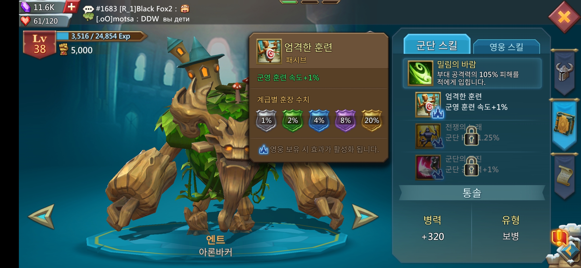 엔트 영웅은 보유 효과가 있다. 군영 훈련 속도 하나의 보유 효과 스킬이 있는데 사실 이 부분 때문에 엔트를 모은다고 보면 된다. 이런 조그만 퍼센테이지들이 계속 누적되어야 나중에 가면 체감이 된다.