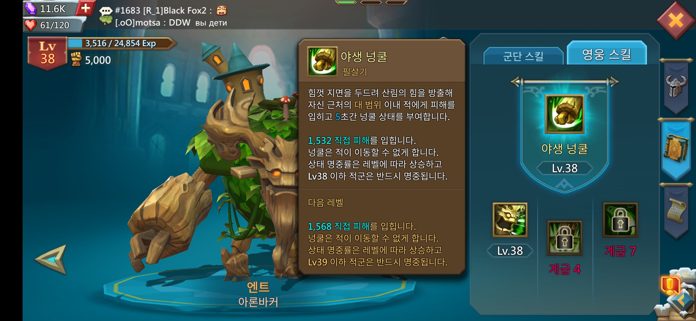 엔트는 탱커류 영웅인데 탱킹 스킬이 생각보다 빈약하다. 로드나이트인가... 다른 탱커 영웅과 비교하면 절대 활용하기 싫은 수준의 스킬이다. 어차피 엔트는 사용하려고 모으는 것이 아니라 군영 훈련 속도를 높이기 위해 보유하려고 모으는 영웅이라 크게 상관은 없다.