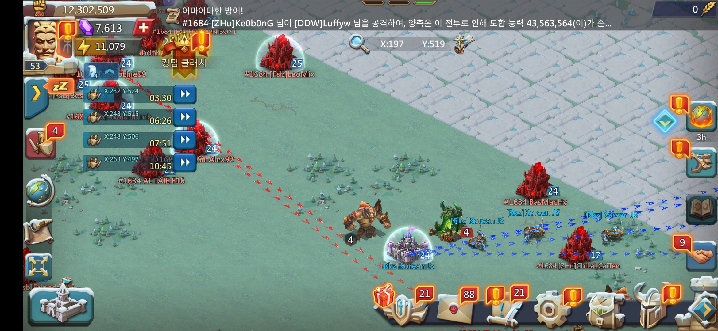 우리 왕국에 DDW라는 1등 연맹이 있는데 이 연맹에 속한 헤비유저들이 상대 왕국 미지를 빼앗아온다. 이럴 때 든든한 우리 왕국 큰형님들이다. 선발주자인 왕국들과 경쟁해도 매번 이기는 걸 보면 올드유저들이 운좋게 우리 왕국으로 부캐를 키우러 온 것이 아닌가 의심이 된다.